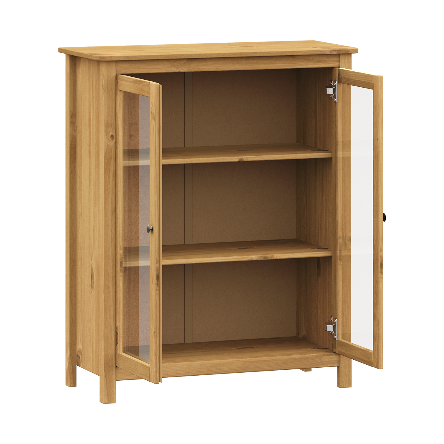 Kod produktu: 8077Vmateriał lita sosna woskowana w odcieniu miodowym metalowe uchwyty w kolorze czarnego mosiądzu dwoje częściowo szklanych drzwi, cztery półki