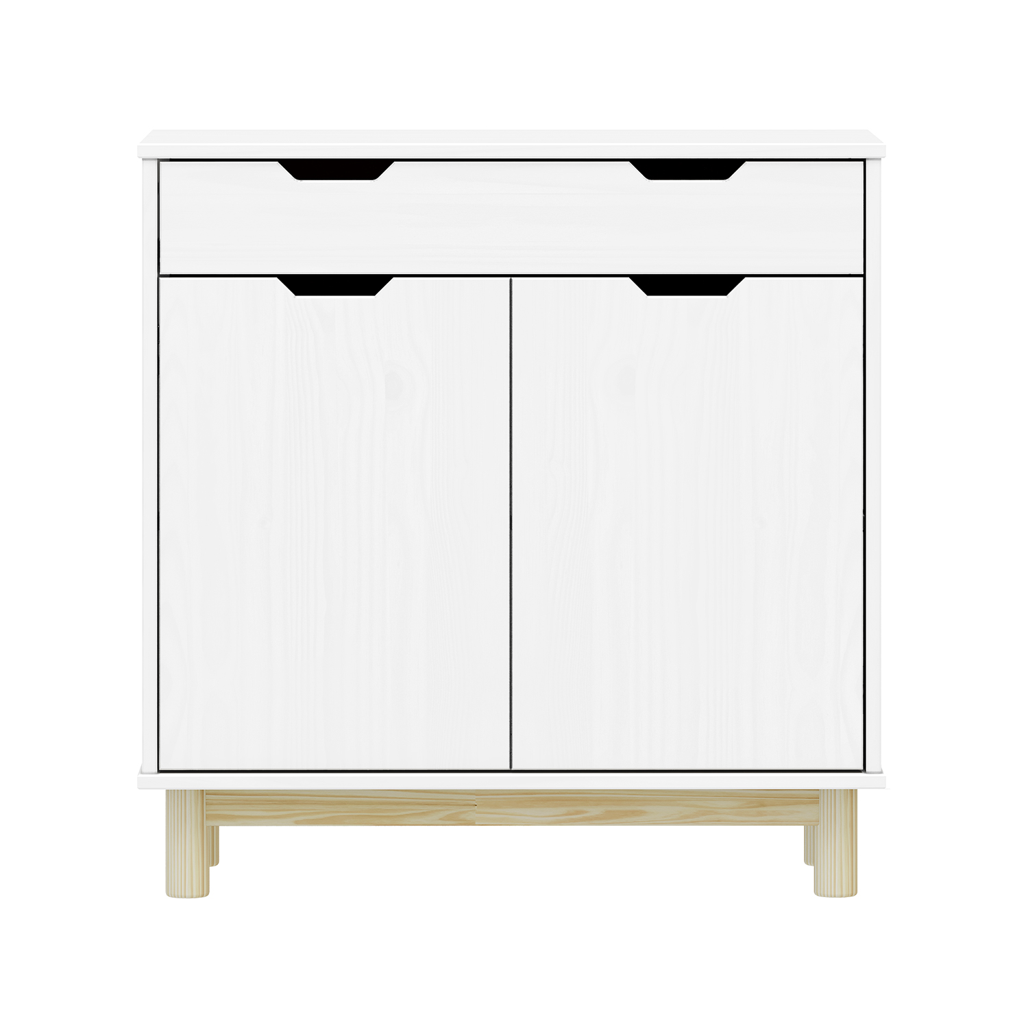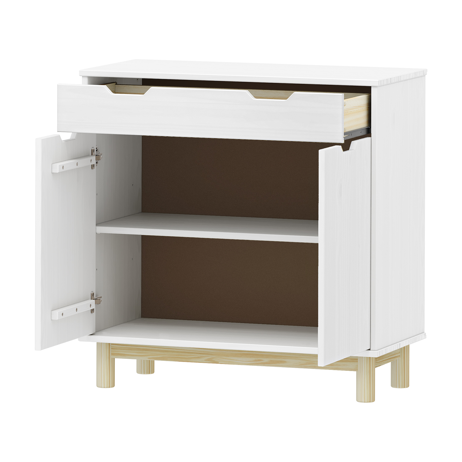 Kod produktu: 32431materiał lita sosna, kolor biały lakier3 szuflady z metalowymi prowadnicami, 2 drzwi, 1 półka