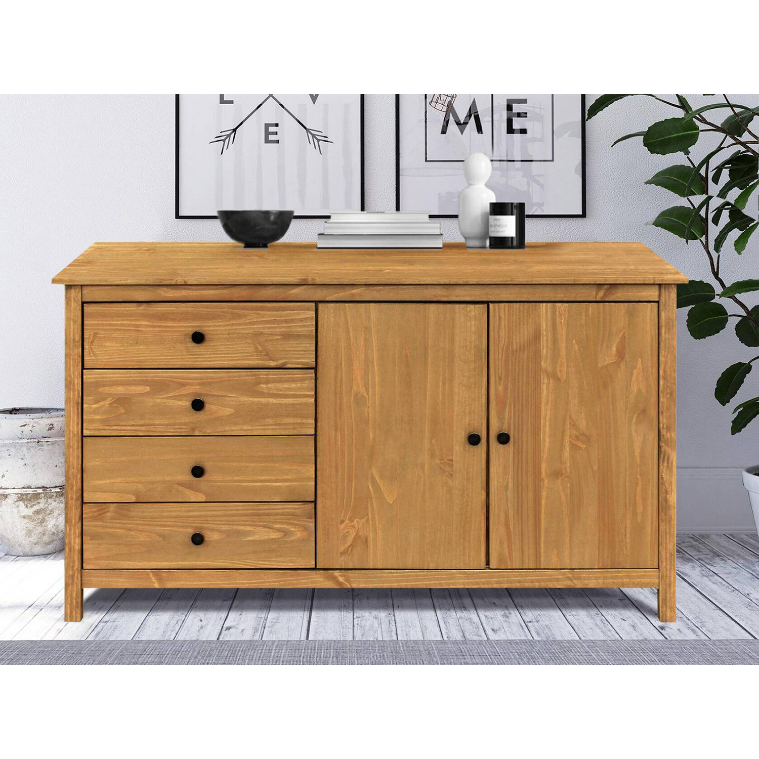 Kod produktu: 8094Vmateriał lita sosna woskowana w odcieniu miodowym metalowe uchwyty w kolorze czarnym 1 drzwi i 4 szuflady z metalowymi prowadnicami