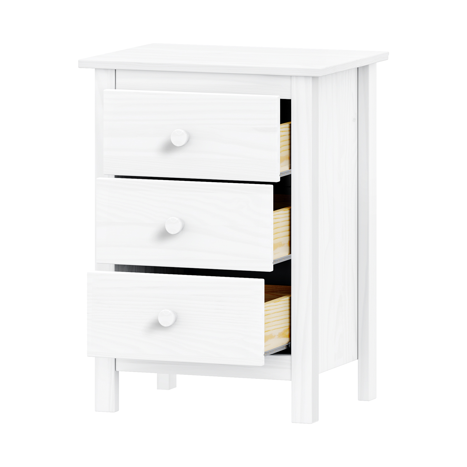 Kod produktu: 8077Bmateriał lite drewno sosnowe, kolor biały lakier 3 szuflady z metalowymi prowadnicami, 1 półka