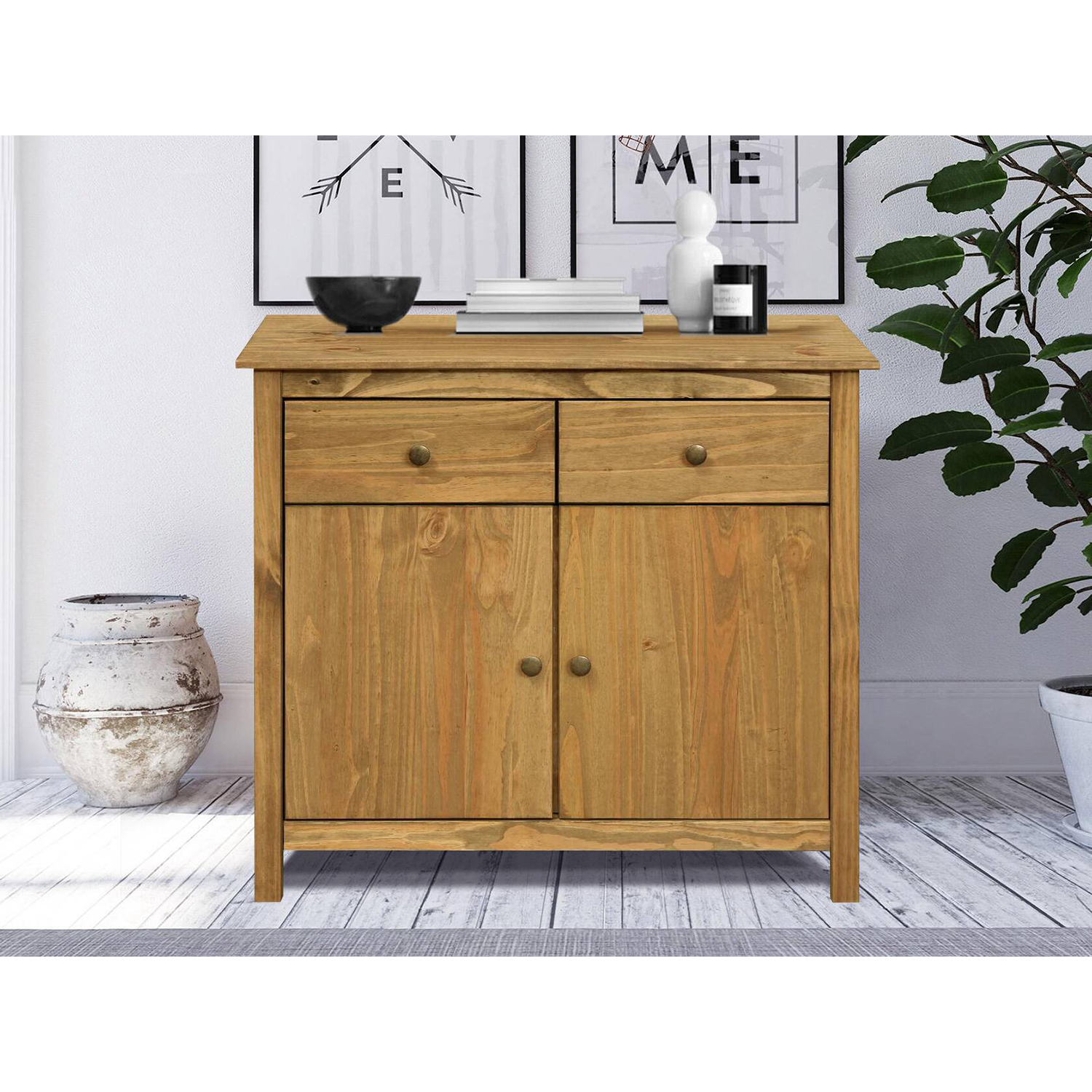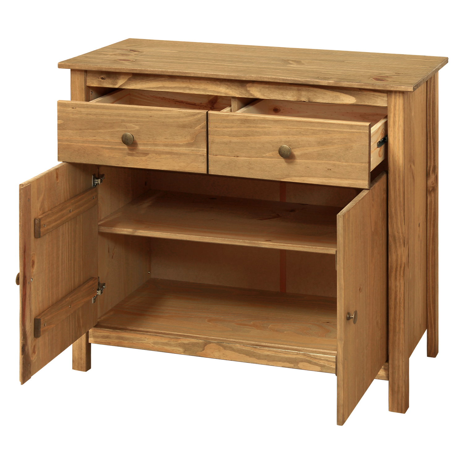 Nowoczesny kredens TORINO 8095V ma dwie szuflady z metalowymi prowadnicami i dwoje drzwi, za którymi znajduje się półka. Kredens może być umieszczony oddzielnie lub uzupełniony o nadstawkę TORINO 8096V. Kredens TORINO z litej sosny woskowanej w miodowym odcieniu ma metalowe uchwyty w kolorze mosiądzu. Solidny kredens doskonale ożywi jadalnię, salon i sypialnię. Kredens ustawiony w jadalni pomieści naczynia, sztućce czy garnki, natomiast kredens w sypialni posłuży na pościel, a w salonie na dokumenty. Kredens to charakterystyczny mebel. Jadalnia i salon z łatwością mogą stać się reprezentacyjnymi przestrzeniami odpowiednimi do przyjmowania gości, wystarczy wyposażyć je w ten oryginalny mebel. Nie musisz być projektantem wnętrz, wystarczy, że wybierzesz ciekawe meble, a wszyscy będą podziwiać twój wyrafinowany gust.