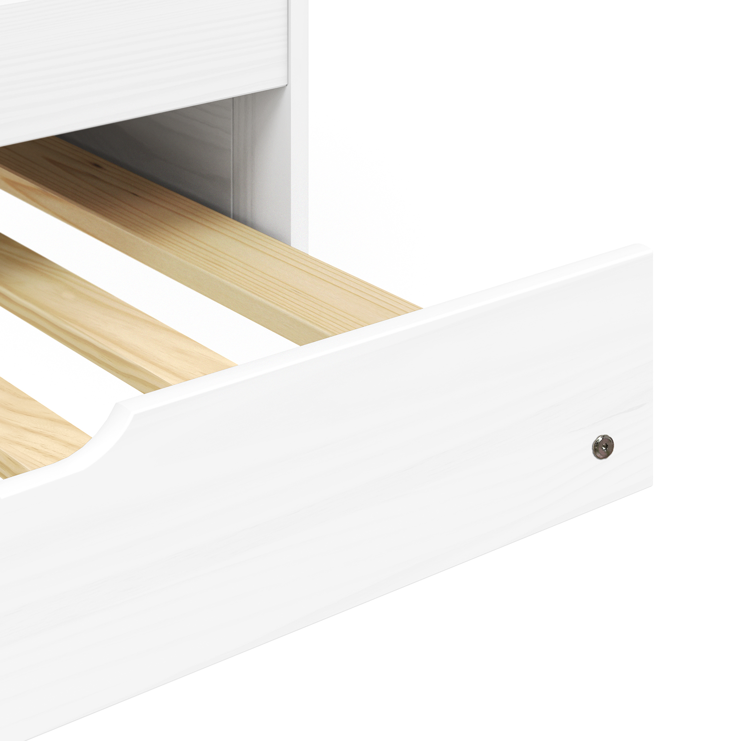 materiał lite drewno sosnowe, kolor biały lakier dwie szerokie szuflady z metalowymi prowadnicami w górnej części drążka szafy oraz 3 półki zalecana nadstawka 8861B