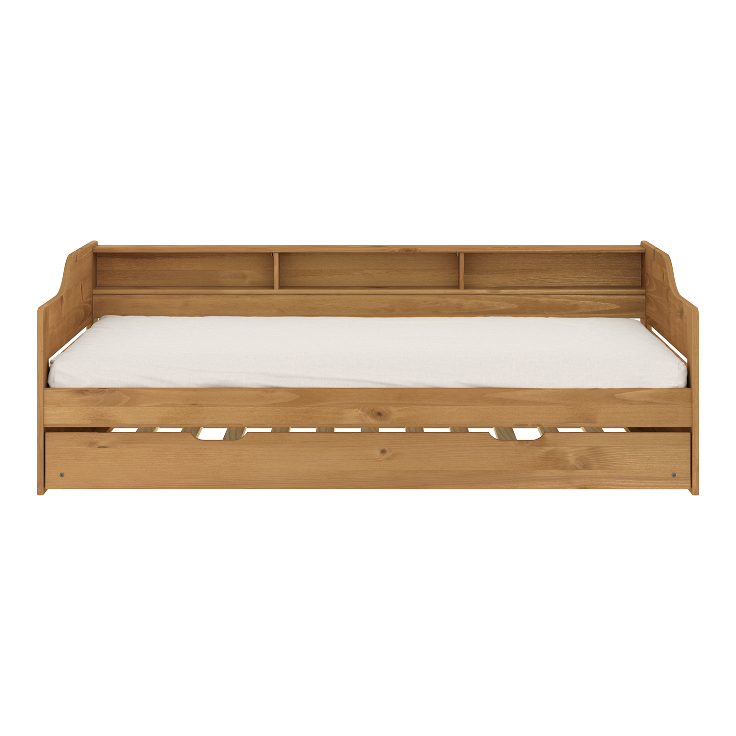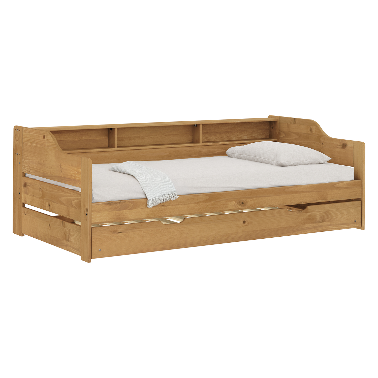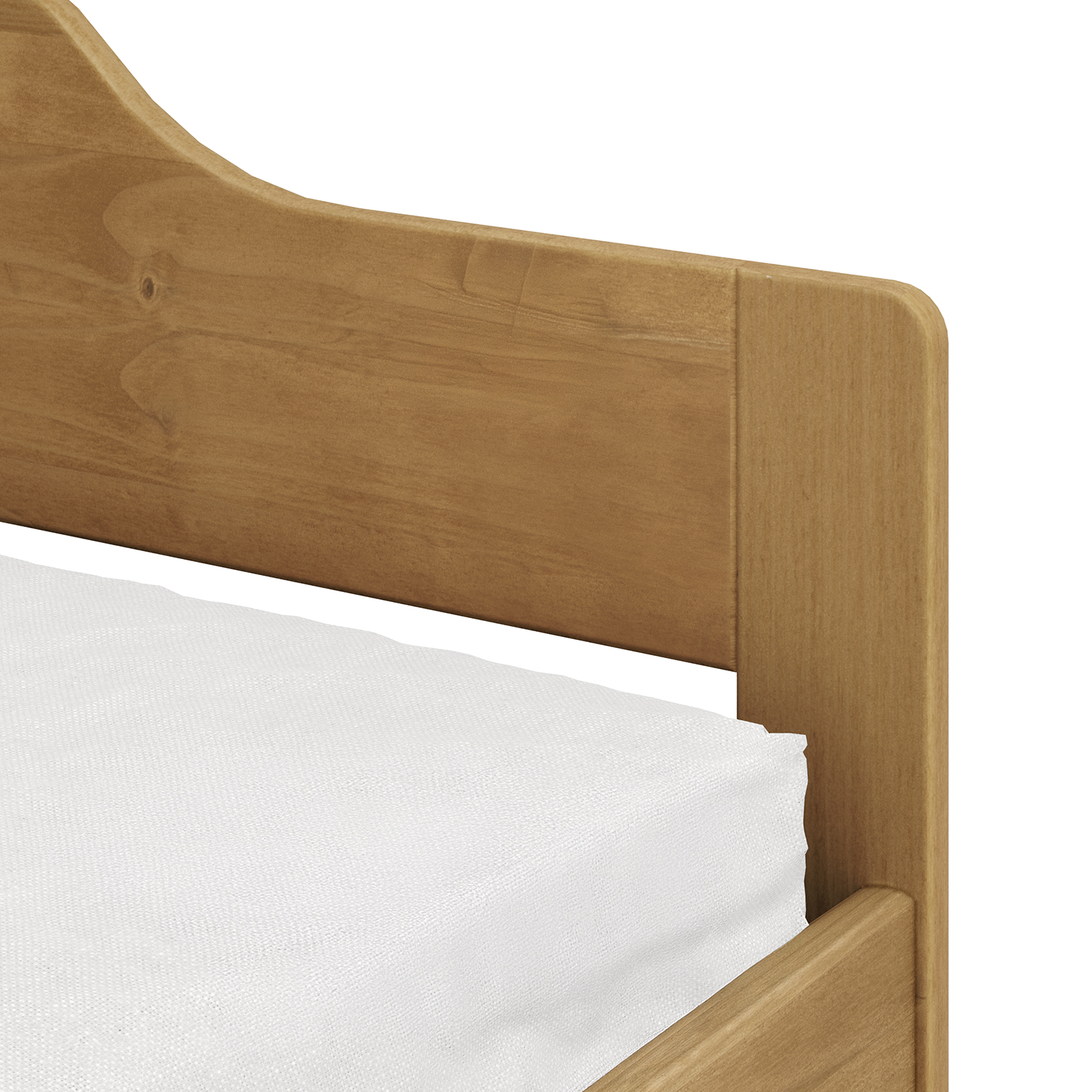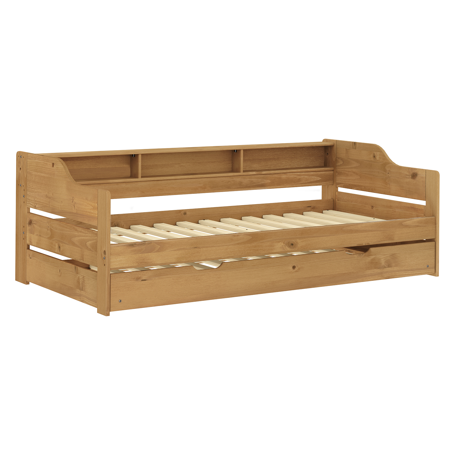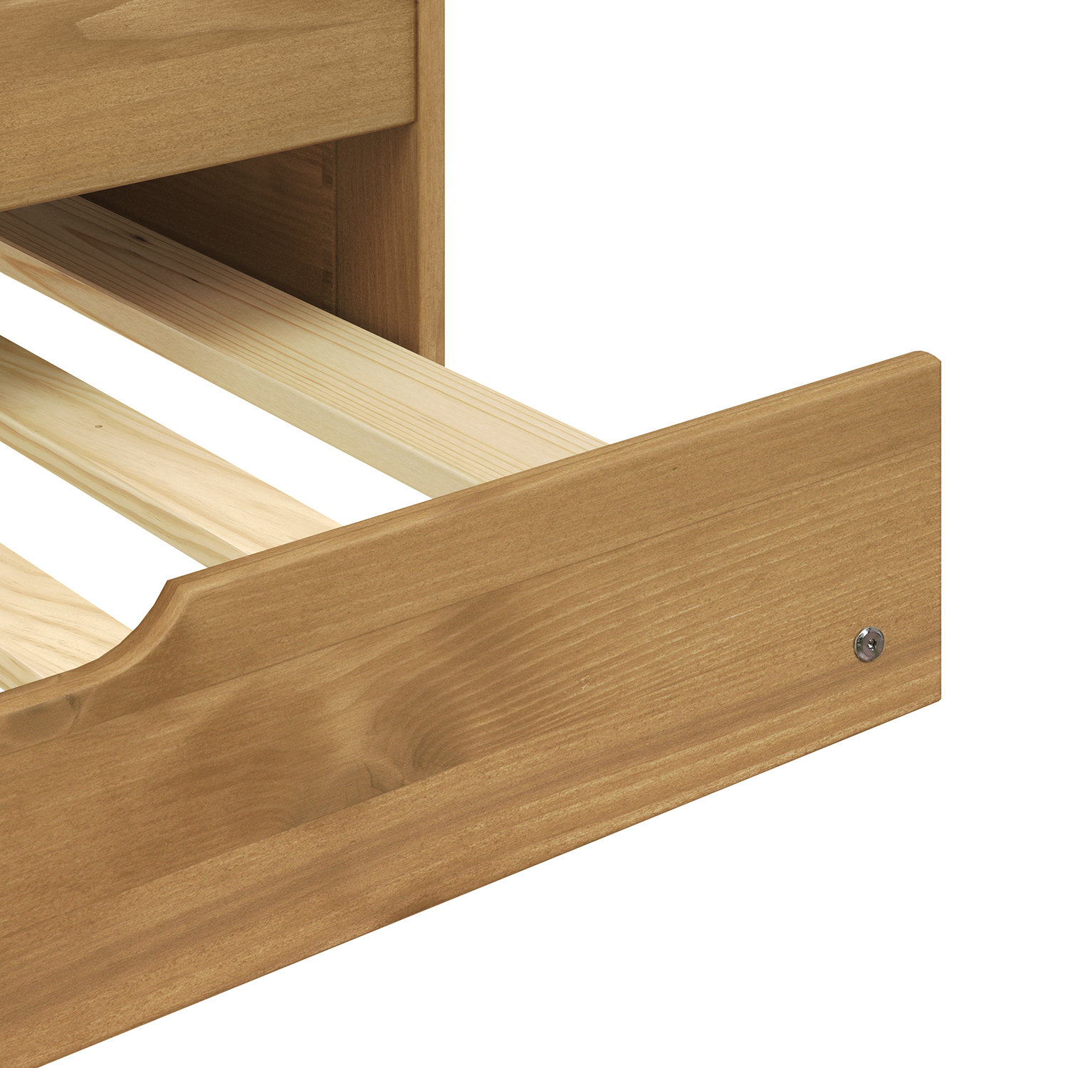 materiał lita sosna, wykończenie woskowane w zestawie 2 szuflady na kółkach cena obejmuje ruszt (listwy drewniane) bez materaca zalecany rozmiar materaca 90 × 200 cm