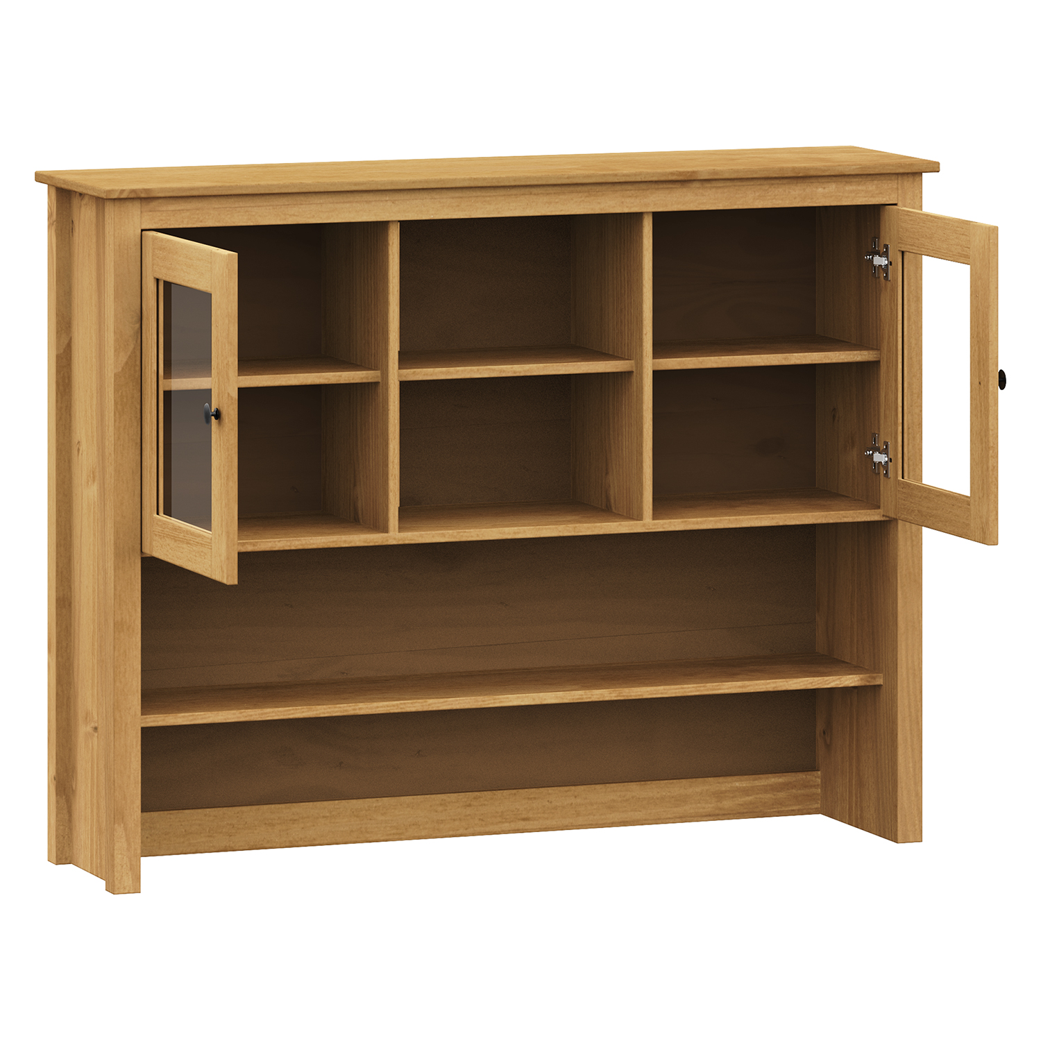 Kod produktu: 8070Vmateriał lita sosna woskowana w odcieniu miodowym metalowe uchwyty w kolorze mosiądzu 2 szklane drzwi, 1 półka nadstawka szafki 8095V