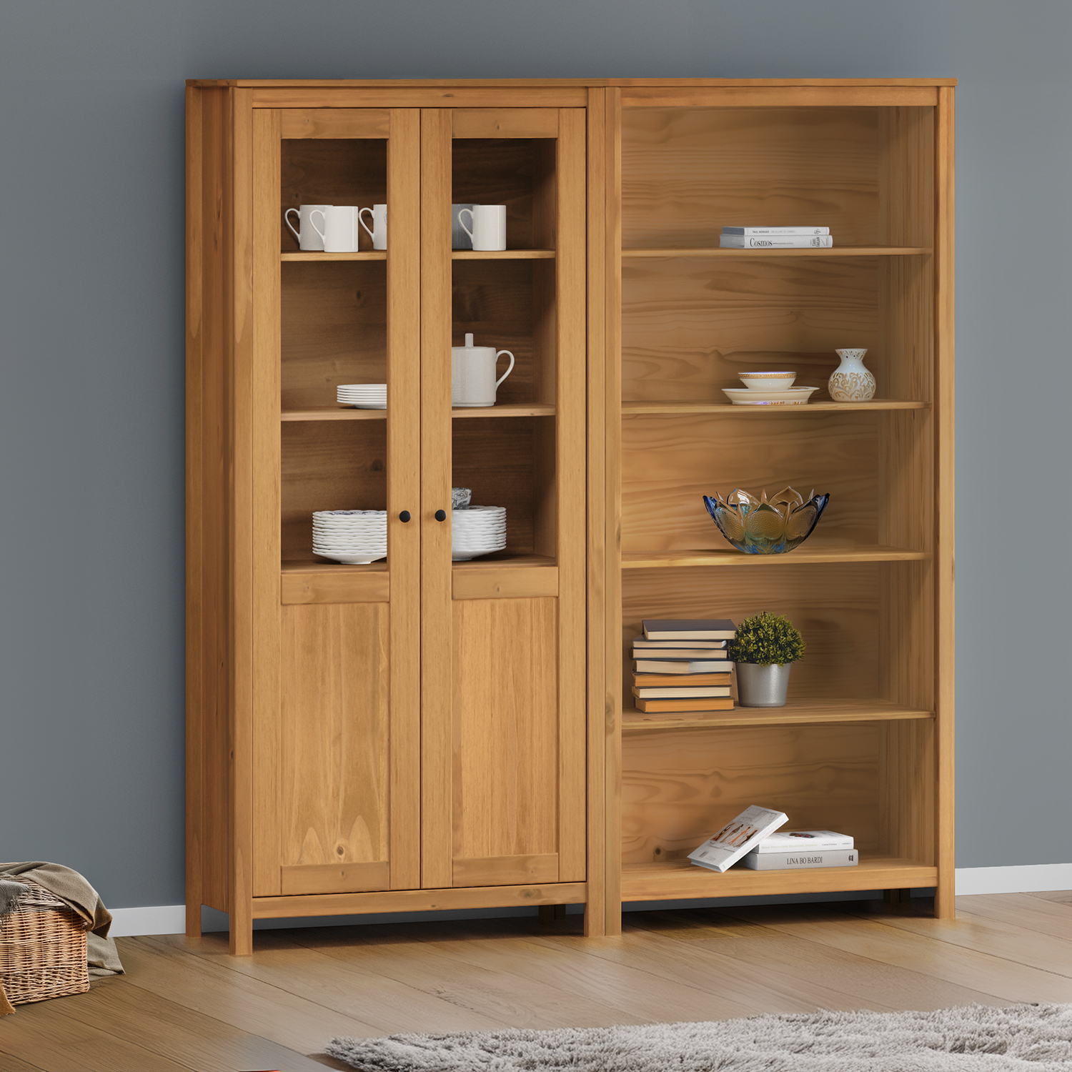 Kod produktu: 8077Vmateriał lita sosna woskowana w odcieniu miodowym metalowe uchwyty w kolorze czarnego mosiądzu dwoje częściowo szklanych drzwi, cztery półki