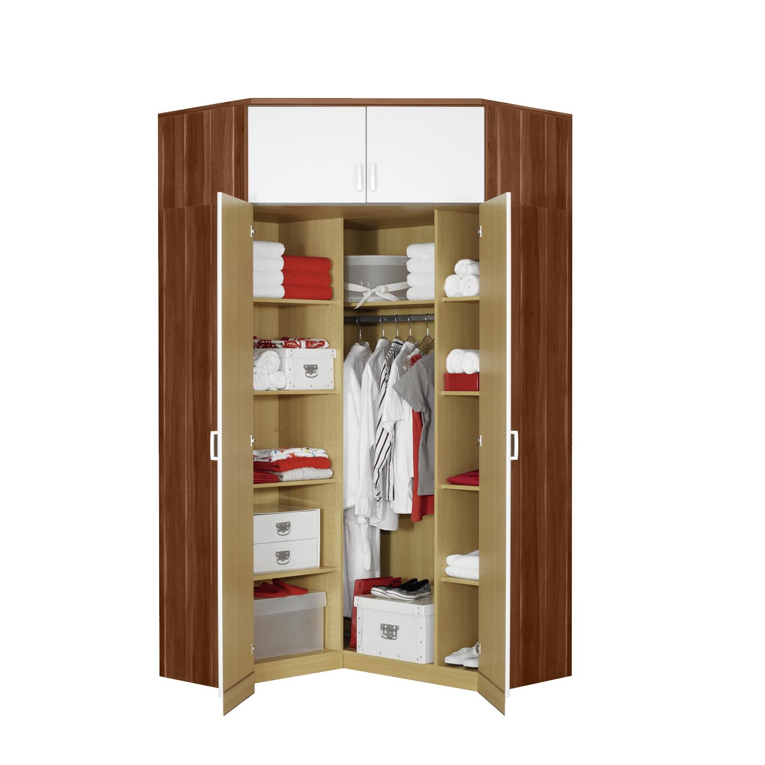Szafy narożne oferują absolutnie wygodny wgląd do garderoby, wszystko jest pięknie i przejrzyście zorganizowane, więc wybór odpowiednich ubrań będzie znacznie łatwiejszy, szafa nie zajmuje też tak dużo miejsca i idealnie pasuje do innych szaf ESO. Narożna szafa ESO 61550 w kolorze orzech/biały zawiera dziewięć półek i stały drążek na ubrania. Szafa jest również wyposażona w poręczną nadstawkę, która nadaje się do przechowywania pościeli. Dzięki indywidualnym szafom ESO możesz stworzyć garderobę, której pozazdrości Ci niejedna kobieta. Piękna szafa narożna będzie pasować absolutnie każdemu, można ją umieścić w pokoju dziecięcym, studenckim, sypialni i garderobie, znajdzie swój kąt wszędzie tam, gdzie przestrzeń jest wyposażona w meble w kolorze orzech/biały. Szafy narożne są jednymi z najbardziej popularnych, ale nic dziwnego, ponieważ nie ma lepszego sposobu na wykorzystanie przestrzeni swojego pokoju niż z pomocą tego praktycznego mebla.