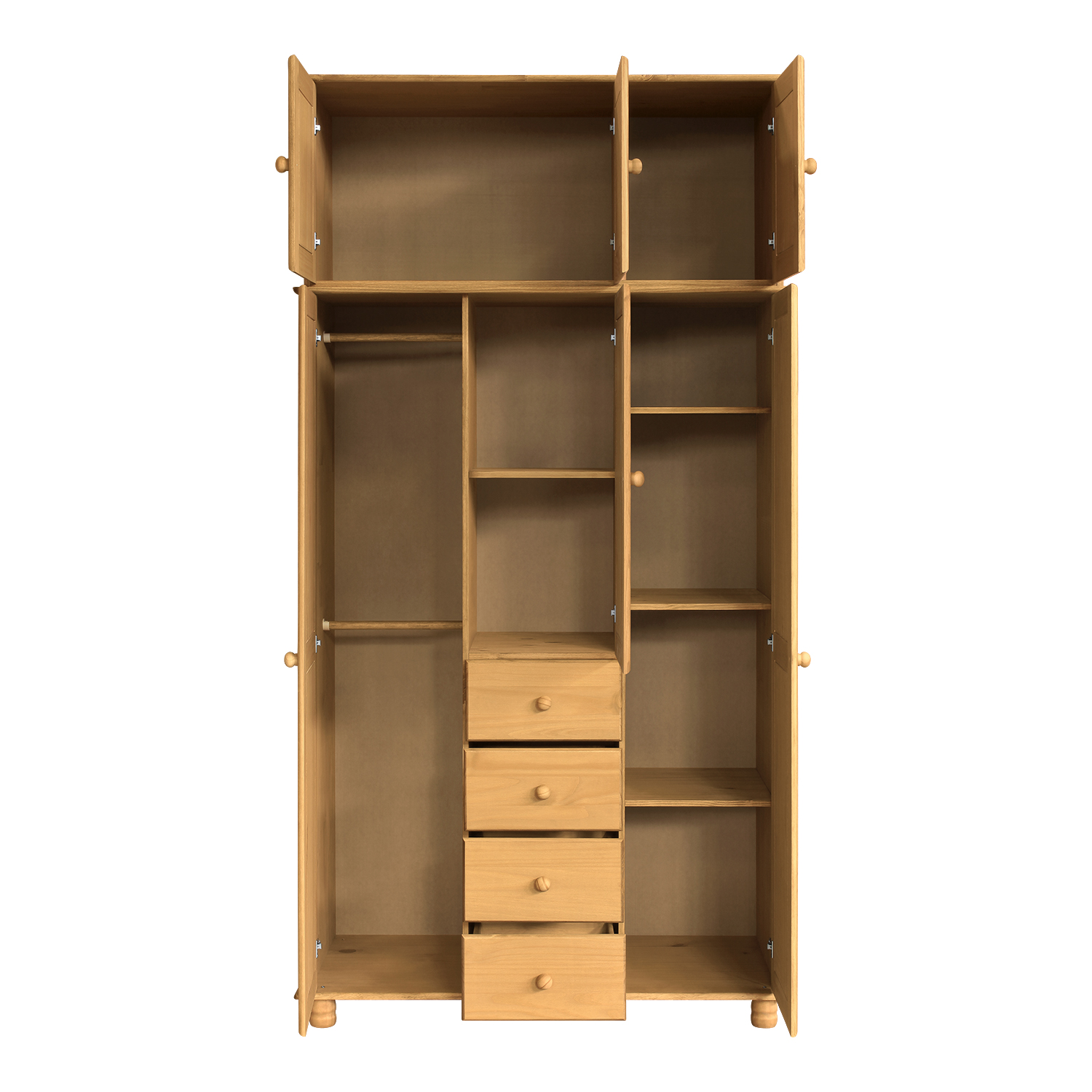 Prezentujemy Ci szafę z litego drewna sosnowego w woskowanym wykończeniu, która wniesie do Twojego domu odrobinę natury i elegancji. Ten mebel łączy w sobie solidność i styl, oferując jednocześnie praktyczne zagospodarowanie przestrzeni. Szafa posiada cztery szuflady z gładkimi metalowymi prowadnicami, zapewniającymi łatwy dostęp i bezproblemowe otwieranie. Po lewej stronie szafy znajdują się dwa drążki, idealne do uporządkowania ubrań w każdym rozmiarze. W środkowej części znajduje się jedna przestronna półka, idealna do przechowywania złożonych ubrań lub akcesoriów. W prawej części znajdują się trzy półki, które zapewniają mnóstwo miejsca na uporządkowanie rzeczy. Aby zmaksymalizować przestrzeń, polecamy nadstawkę 8864V, która doskonale uzupełnia tę już i tak wszechstronną szafę. Zainwestuj w jakość i elegancję dzięki tej szafie z litego drewna sosnowego, która upiększy Twoje wnętrze i zaoferuje praktyczne rozwiązanie dla codziennych potrzeb.