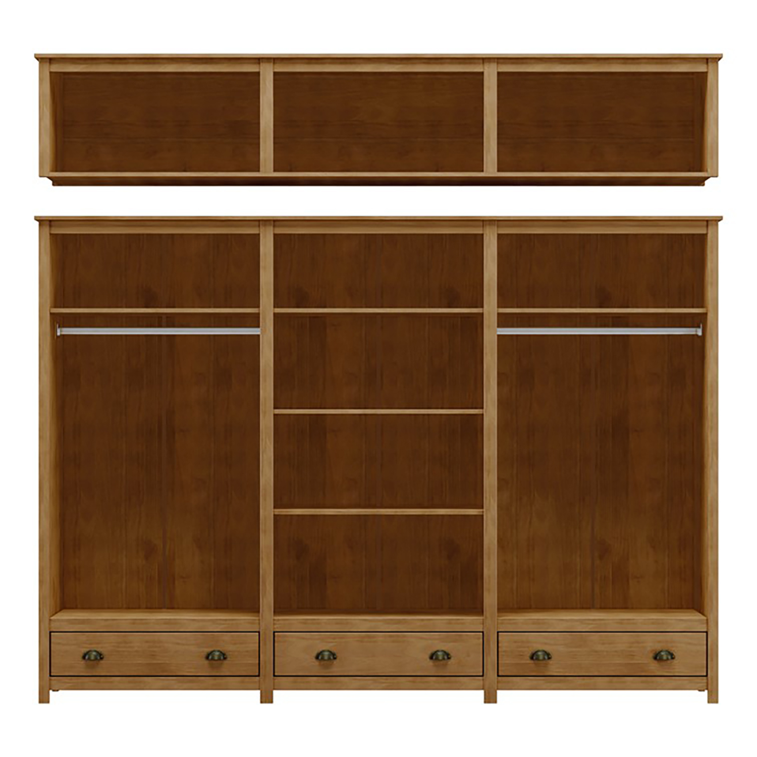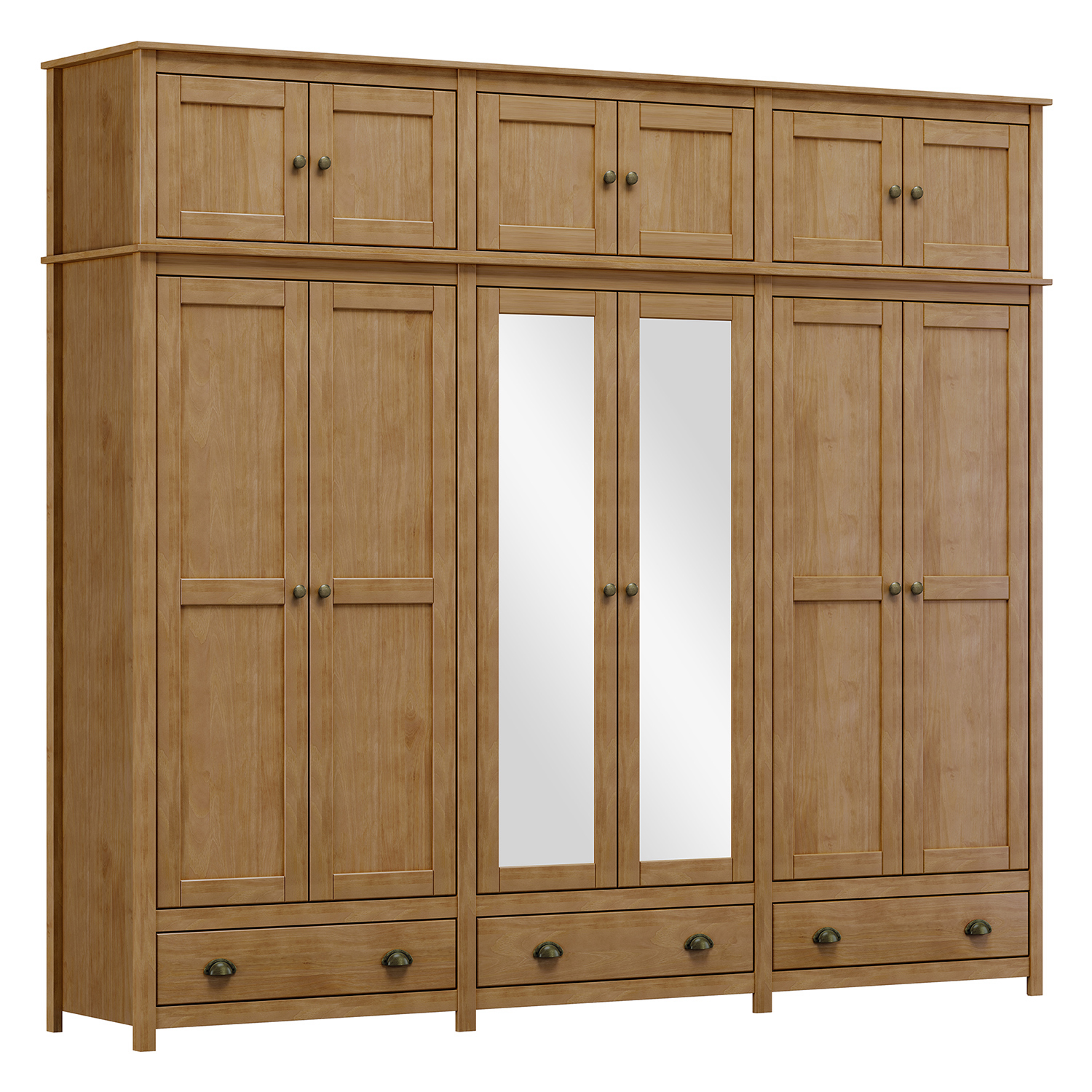 1 półka i metalowy drążek w lewej i prawej części, 3 półki w środkowej części, lustro na dwóch środkowych drzwiach