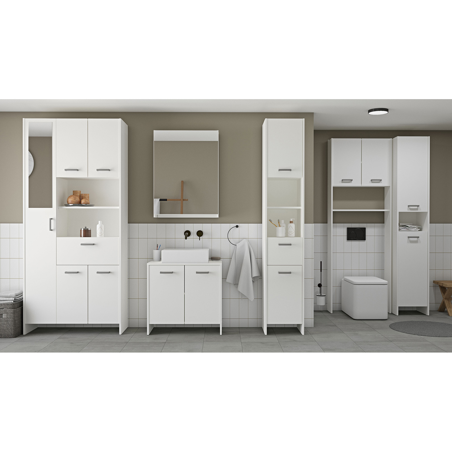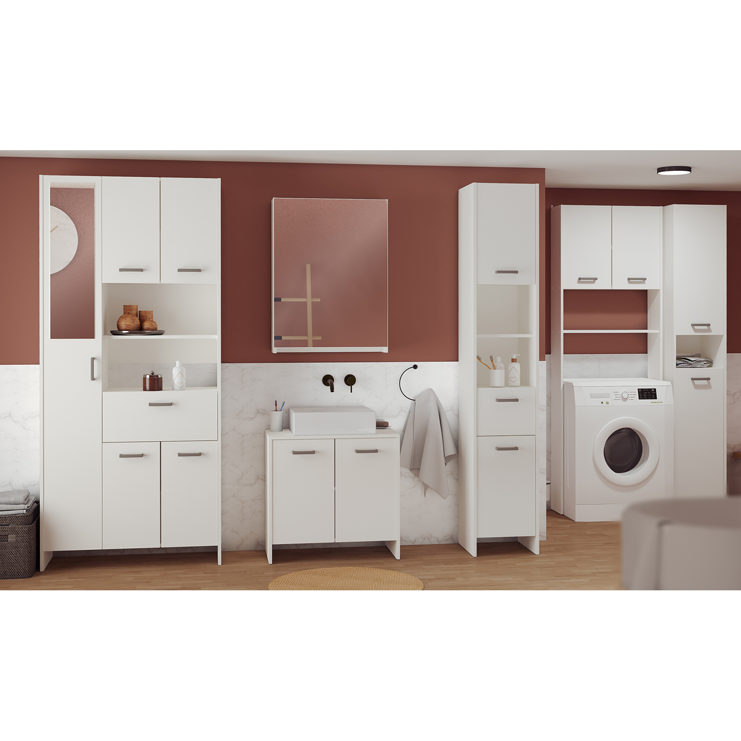 Szafka na pralkę KORAL w kolorze białym to idealne rozwiązanie do efektywnego wykorzystania przestrzeni w łazience. Ta praktyczna, wąska szafka o wymiarach 66 × 21 × 185 cm (w/h/v) została zaprojektowana tak, aby wygodnie mieściła się nad większością standardowych pralek. Zawiera dwoje drzwi, za którymi znajduje się jedna półka i jedna otwarta półka, która umożliwia wyeksponowanie kosmetyków, dekoracji lub innych drobnych przedmiotów. Szafka wykonana jest z trwałego laminowanego materiału, który jest łatwy w utrzymaniu i zapewnia długą żywotność. Eleganckie białe wykończenie jest idealne do każdego stylu łazienki, nadając przestrzeni czysty i świeży wygląd. Szafka obejmuje również system KORAL, który oferuje inne kompatybilne meble dla harmonijnego wnętrza. Produkt ten nie tylko zapewnia praktyczną przestrzeń do przechowywania, ale także pomaga zorganizować niezbędne akcesoria łazienkowe na minimalnej przestrzeni. Jest to idealny wybór do małych łazienek lub jako stylowy dodatek do istniejącego wyposażenia.