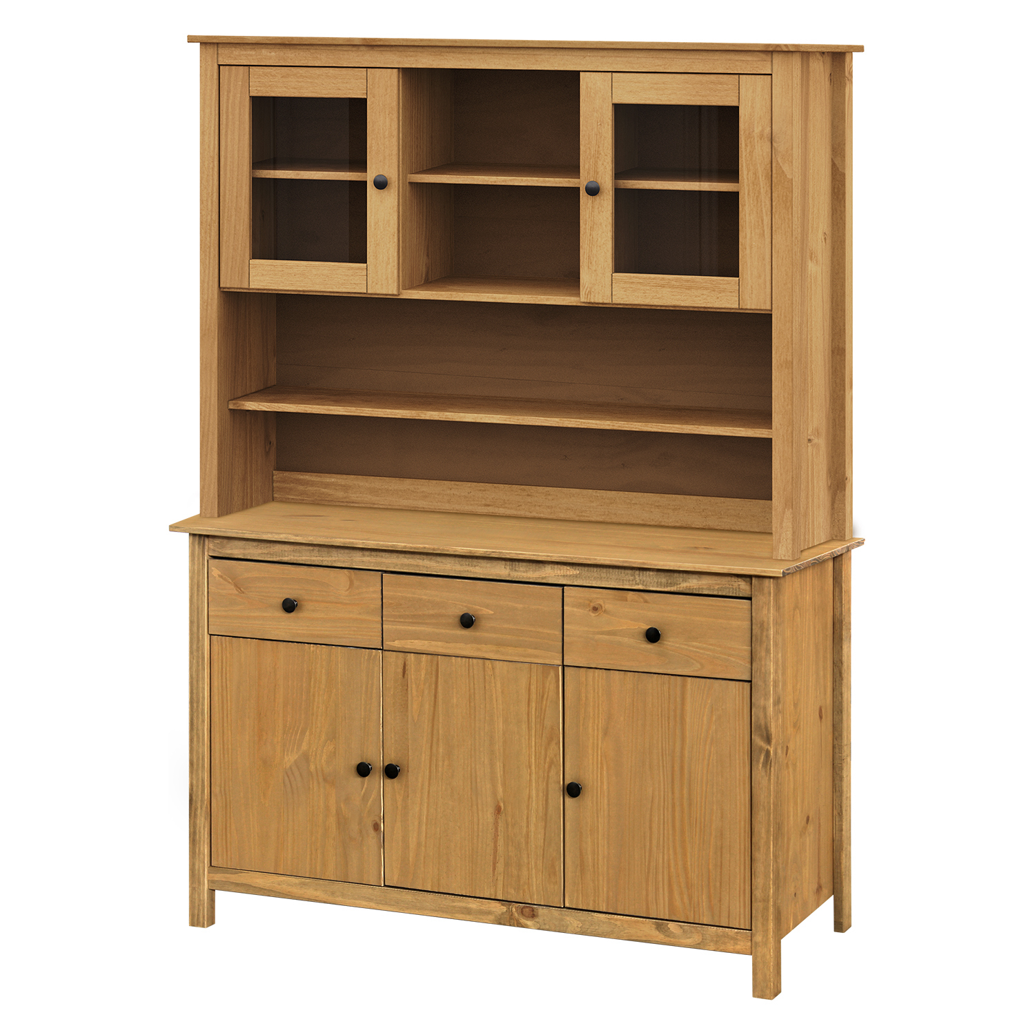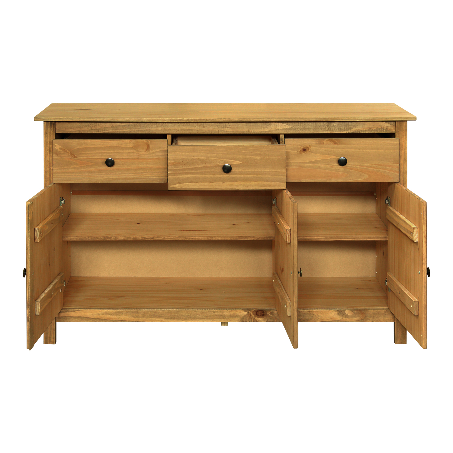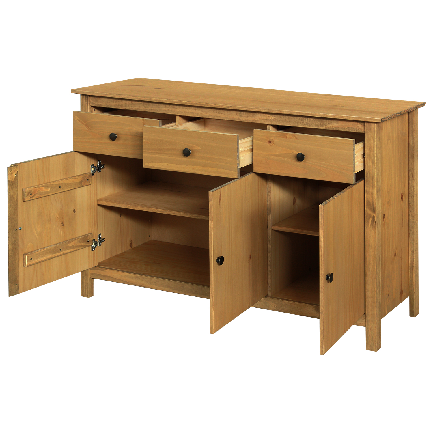 Kod produktu: 8093Vmateriał lite drewno sosnowe woskowane w odcieniu miodowym metalowe uchwyty w kolorze czernionego mosiądzu 3 drzwi, 3 szuflady z metalowymi prowadnicami
